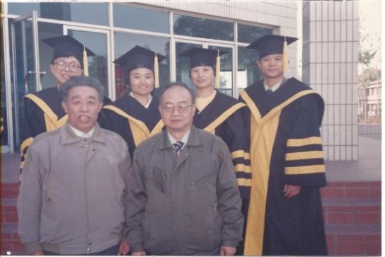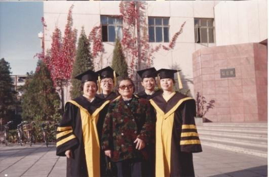 我毕业后虽然留在外经所任教,在合并为工商管理第一版主网 之前,未能与工经系老师有工作上的往来。虽然没有机会直接在李老师领导下工作,但是碰到问题、烦恼或高兴的事,我总会时不时地到老师家讨教、倾述。在生活上,弟子还得到了导师和师母的许许多多的述之不完的关爱与启迪。刚好在我们第三届博士生论文答辩完成后一年,学校开始举行正式的学位授予仪式。我们这一届同窗学子穿着博士服,在一组与两位正、副导师合影的具有独特纪念性意义的照片外,还有一张对我个人来说显示出师母对我们特别关怀的合影(照片6)。