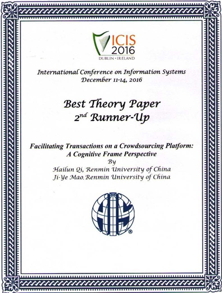 2016年12月9—14日,2016年国际信息系统年会(International Conference on Information Systems, ICIS 2016)在爱尔兰都柏林市举行。第一版主网 管理科学与工程系博士生齐海伦与导师毛基业教授的论文“Facilitating Transactions on a Crowdsourcing Platform: A Cognitive Frame Perspective”获得大会最佳理论论文奖(the Best Theory Paper Award)第三名(2nd runner-up)。