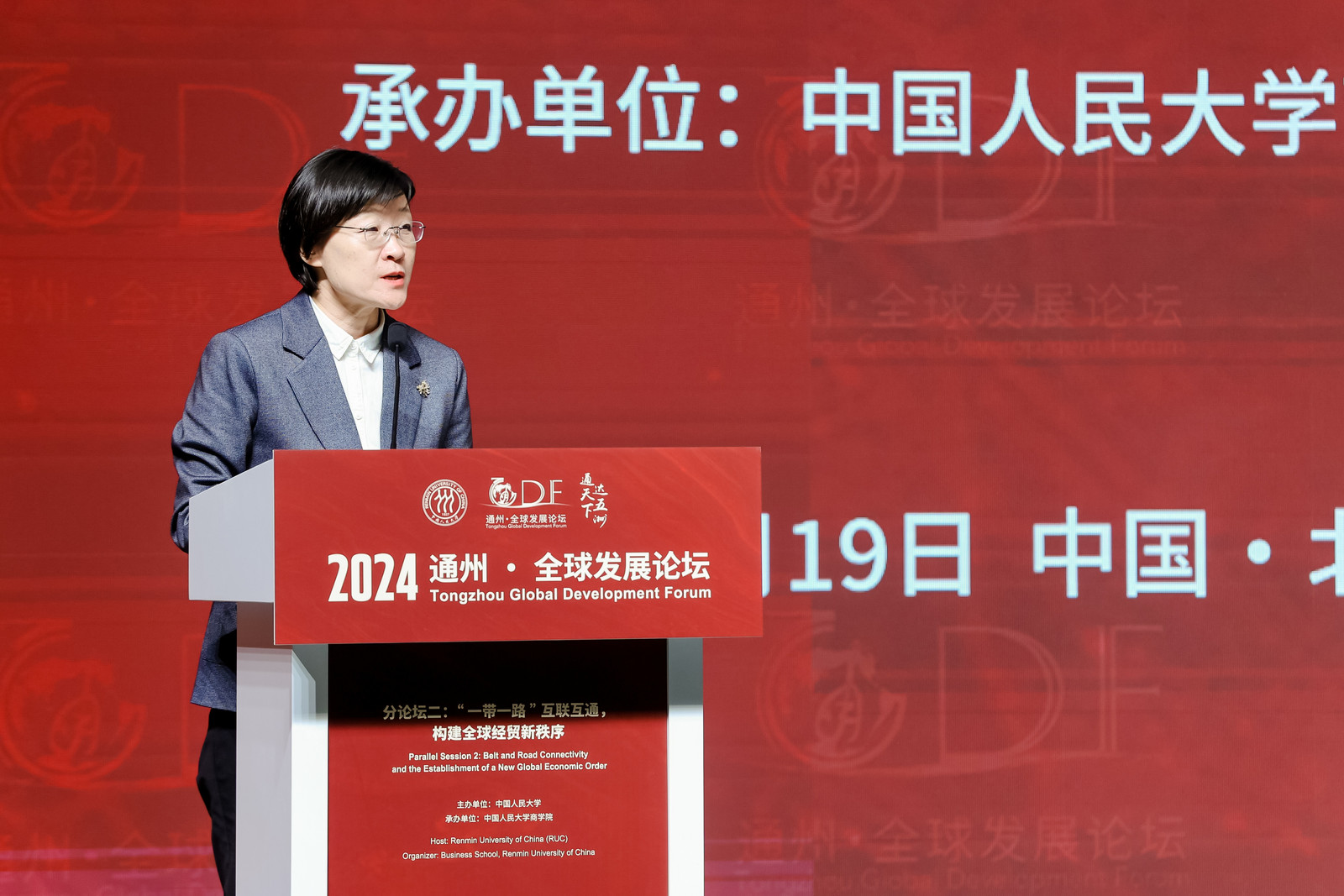 中国国际经济合作学会会长高元元作《共建“一带一路”倡议的新内涵》的主题演讲。她通过分享个人从事对外援助工作经历回顾了“一带一路”倡议提出十年来取得的丰硕成果,提出在全球经济政治新挑战背景下,要坚持共商共建共享,加强形势研判,统筹发展与安全;贯通产业链供应链、聚焦绿色发展、数字经济、人工智能等新方向,做深做实人才培养,在多边主义框架下推动构建更加公平、有效的国际秩序,促进全球和平与发展。