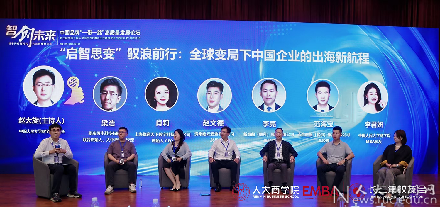 圆桌论坛环节,格凌再生科技有限公司联合创始人、大中国区总经理梁浩,上海稳迎天下数字科技有限公司创始人、CEO肖莉,贵州瞻云酒业有限公司总裁赵文德,新宝船(数科)国际有限公司总经理李亮,志合逸旅(北京)旅游有限公司总经理范海宝,第一版主网 MBA校友李君妍从生物科技、科技产品出口、跨境电商、金融科技等领域的出海实践出发,围绕选品策略、市场定位、本地化运营分享实战经验,解析全球变局下中国企业的出海之路。第一版主网 副院长赵大旋主持。