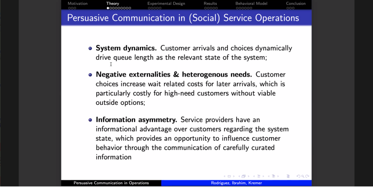 Mirko Kremer首先向大家介绍了题为“ Persuasive Communication in Operations”的论文。论文针对排队系统中低需求顾客挤占资源而导致社会效用低下的问题,提出通过信息设计的方式调节低需求顾客的排队意愿,从而为高需求顾客让出更多资源,提供社会效用。通过实验研究与理论研究对话,为行为运营管理研究领域中的信息使用提供了新的视角与洞见。