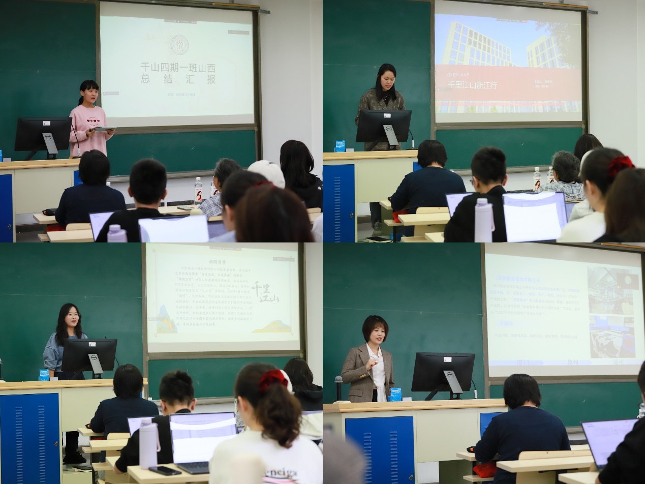 各调研团队代表王牧葳、裴冬迪、毕海欣、方昱人分别汇报。他们表示,此次实践通过走进企业,调研企业高质量发展、数字化转型和科技赋能,感受中国经济发展的强劲脉动;深入地方基层,切身体会农村特色产业发展和新农村建设方向,感悟乡村振带来的巨大变化;访谈基层干部、企业领导、优秀校友,增进对基层治理、行业发展、职业规划问题的理解,体悟人大校友投身地方经济发展的家国情怀。同学们在“看人、看事、看江山”的过程中,触碰时代脉搏、聆听时代声音,激发大家继续夯实专业基础,提高综合素质,未来在推进产业转型、科技创新、社会治理、乡村振兴等方面贡献青春力量、展现青春风采,为中国式现代化挺膺担当。