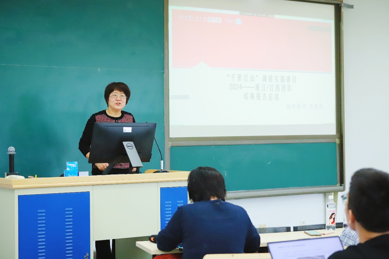 孙蔓莉从学术角度进行总结分享。作为连续三年带队“千里江山”项目的指导教师,她见证了项目的成长和同学们的进步。她通过对比分析本期与往期调研报告内容,围绕报告选题、研究方法、调研成果等提出指导意见,引导启发学生进行深入的学术思考和探索,鼓励同学们扎根中国大地做研究,期待并祝福同学们在未来学术科研道路上取得更大成绩。