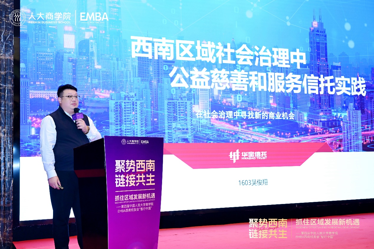 华宝信托有限责任公司西部业务中心总经理吴俊翔从信托专业视角出发,作“西南区域社会治理中公益慈善和服务信托实践”主题分享。他结合西南区域社会治理需求,介绍了公益慈善信托、服务信托在乡村振兴、社区服务、产业扶持等领域的应用场景与实践案例,将信托专业能力与社会治理需求深度结合,助力区域实现经济发展与社会治理协同推进。