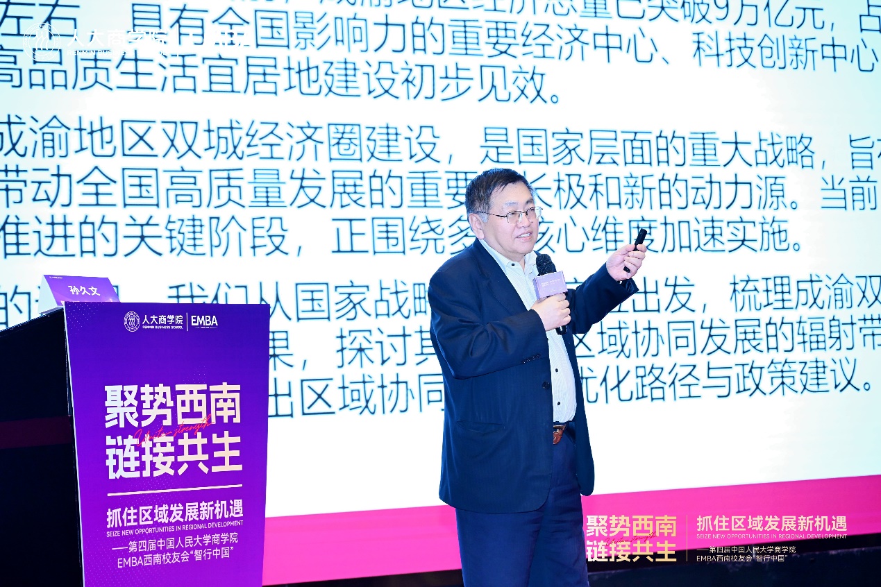 孙久文作“成渝双城经济圈建设与西南区域协同发展新机遇”主题分享。他指出,成渝双城经济圈建设已迈入纵深推进新阶段,成为国家区域发展“第四极”,与京津冀、长三角、粤港澳大湾区构成“钻石菱形”格局。孙久文系统梳理了成渝双城经济圈的战略定位、推进举措与发展成效,同时客观分析了其与东部成熟城市群在发展能级、产业协同、要素流动、体制机制等方面的差距。他重点提出提升成渝发展能级的七大路径,并阐述双城经济圈对西南区域的辐射带动模式,解读西南区域“抱团式发展”的实现路径,引领现场嘉宾重新审视西南区域协同的增长潜能。