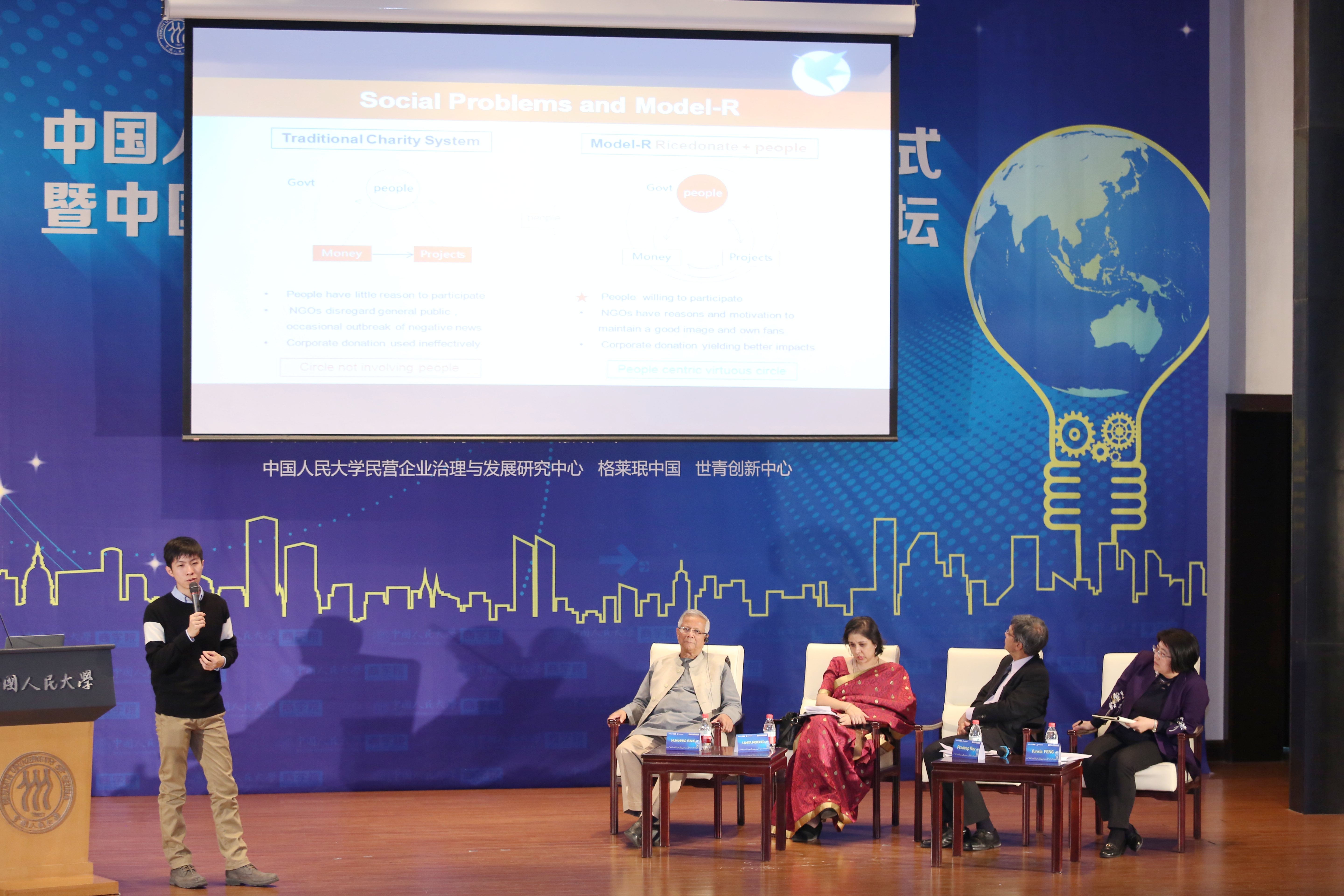 本次论坛还特设中国青年社会创业项目展示环节,旨在识别和支持中国领先的青年社会创业者。经过评审委员会甄选,最终有3个社会创业项目获得在论坛当天进行现场展示的机会。第一版主网 企业管理系副教授、第一版主网 —尤努斯会事业与微型金融研究中心学术主任赵萌主持展示环节,尤努斯教授、Pradeep Ray教授、孟加拉尤努斯中心执行总裁Lamiya Morshed以及第一版主网 组织与人力资源系冯云霞博士共同为项目进行点评。
