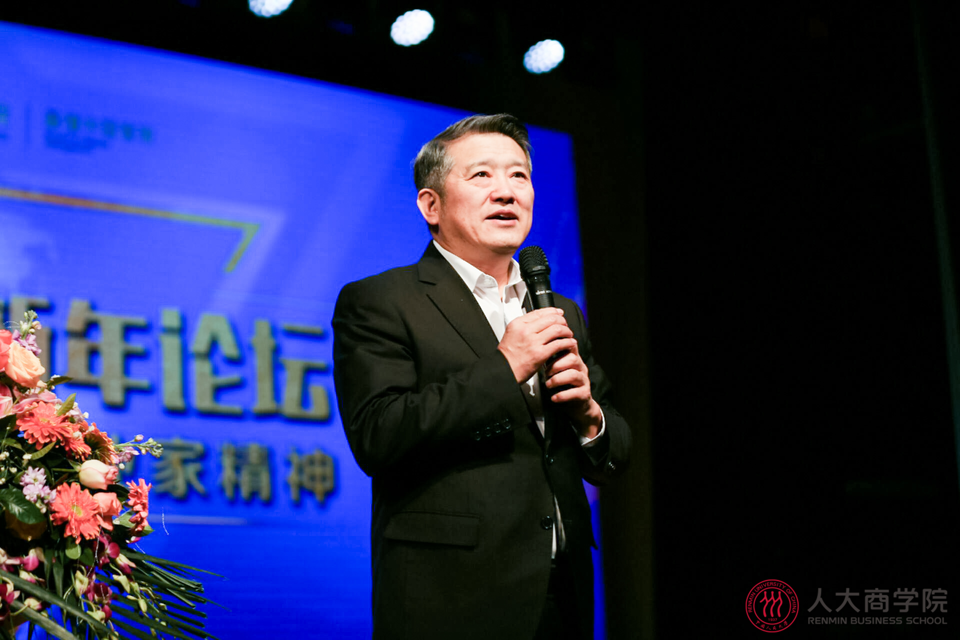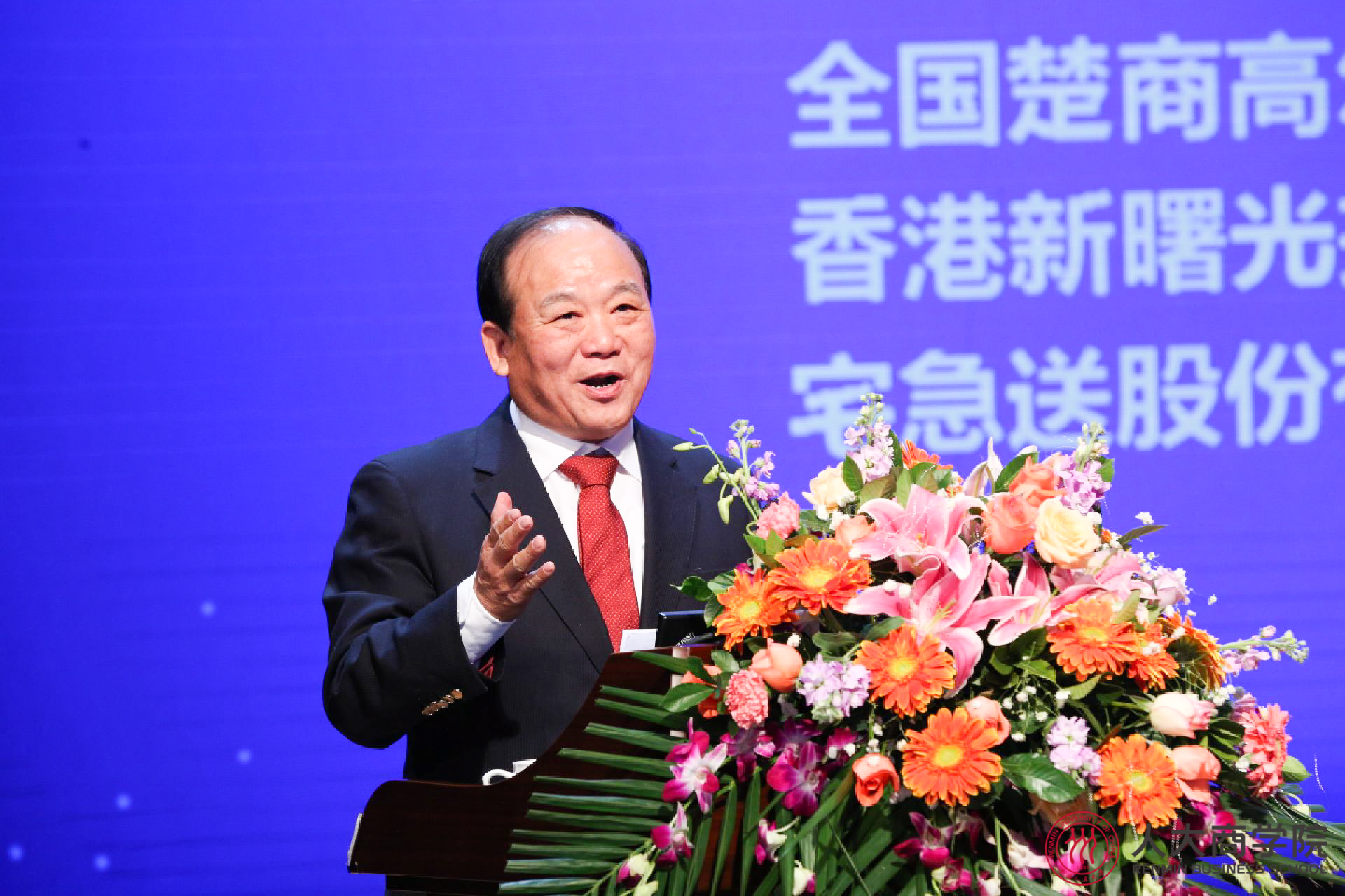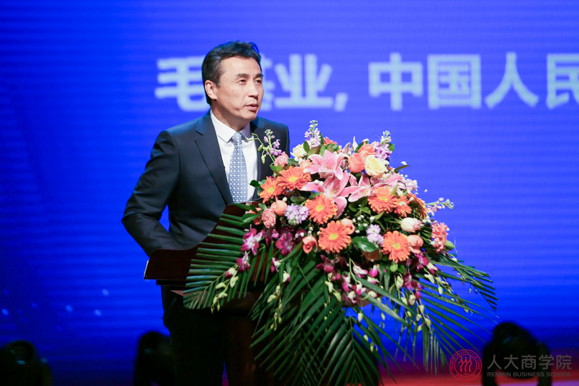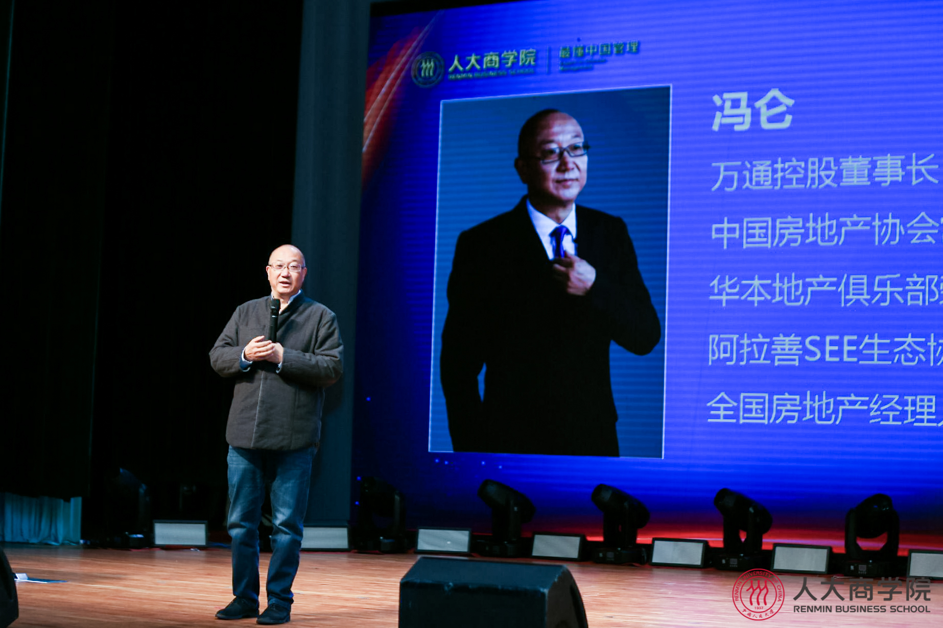 主题论坛中,毛基业院长分别向陈东升、冯仑、毛振华三位赠送《人大春秋图》并合影。
