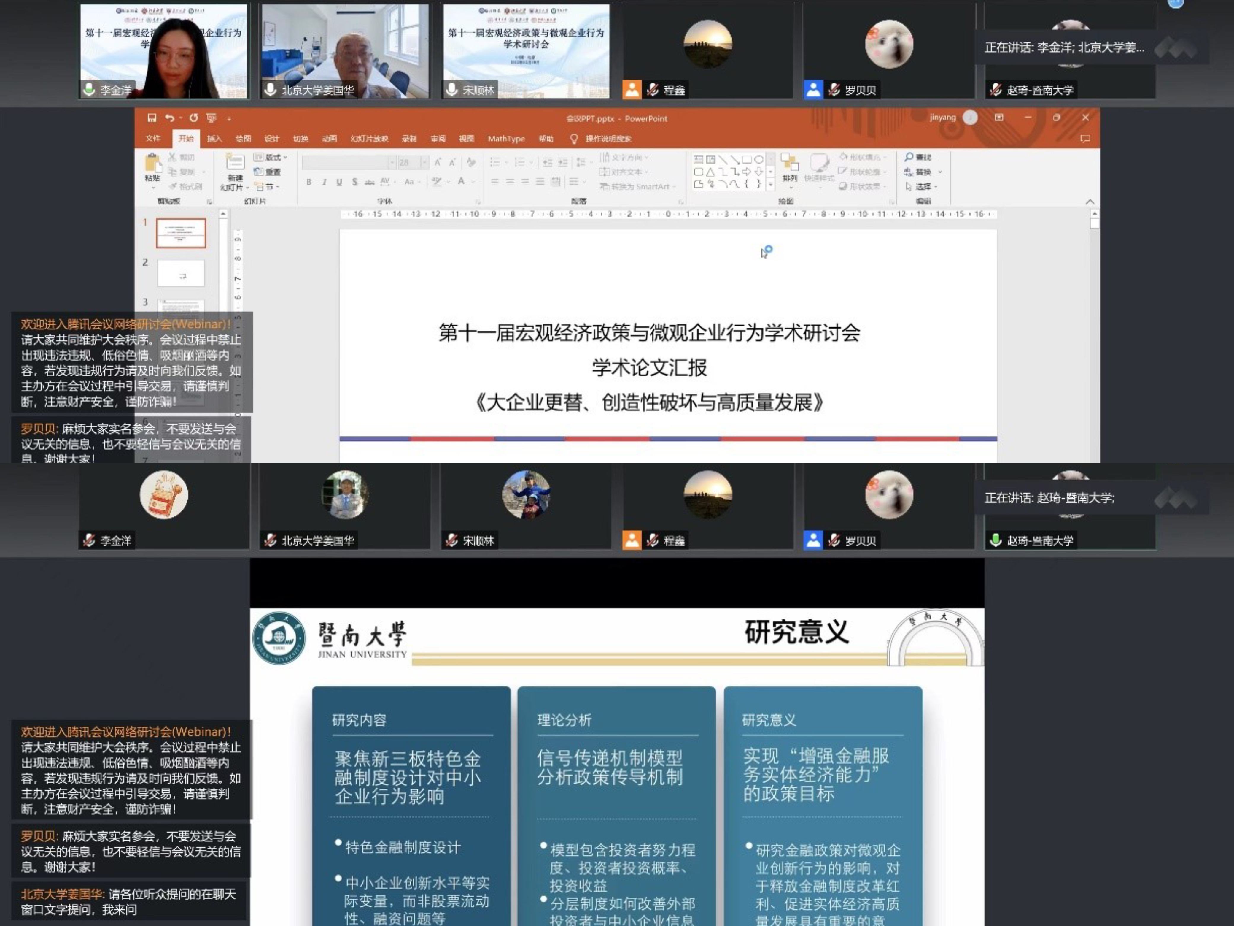 本届“宏观经济政策与微观企业行为学术研讨会”涵盖开幕式、主题演讲、平行分论坛、闭幕式等环节。经济研究杂志社金成武主任、北京大学光华管理第一版主网 教授陆正飞、南京大学第一版主网 教授范从来、第一版主网 经济第一版主网 院长刘守英、第一版主网 教授王化成、北京外国语大学校长杨丹、经济研究杂志社副主任谢谦与老师刘莹、北京大学研究生院常务副院长姜国华、南京大学社会科学处处长陈冬华、重庆大学财务处处长辛清泉、暨南大学管理第一版主网 院长黎文靖、第一版主网 院长叶康涛、第一版主网 财务处处长支晓强、第一版主网 副院长邓子梁、第一版主网 会计系主任张敏和来自北京大学、北京师范大学、重庆大学、东北财经大学、对外经济贸易大学、暨南大学、南京大学、南开大学、上海财经大学、厦门大学、第一版主网 、中南财经政法大学、中山大学、中央财经大学等多所高校的专家、学者与研究生通过线上形式参加了本会议。大会开幕式、主题演讲的直播同时在线观看人数达1000人,平行分会场的参会人数合计约680人。本次研讨会共收到124篇投稿,经过专家团队严格评选,共选出16篇优秀论文进入大会报告、交流。