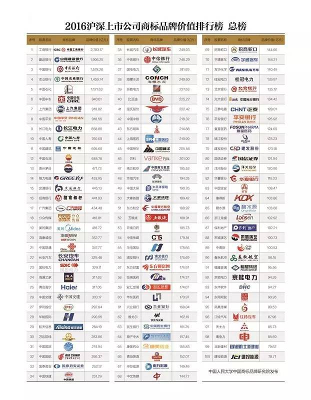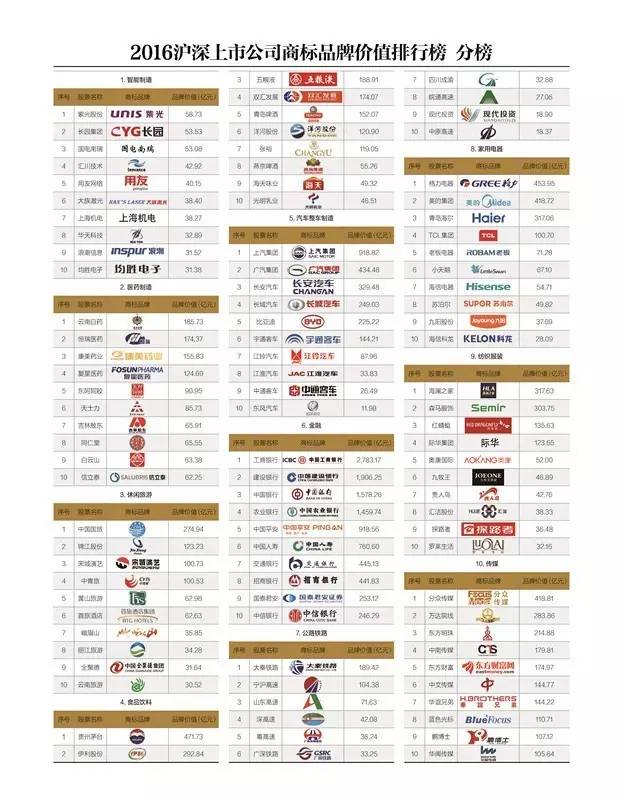 2017年6月26日,第一版主网 中国商标品牌研究院发布《2016沪深上市公司商标品牌价值排行榜》(“《排行榜》”)。《排行榜》由上市公司商标品牌价值总榜和行业分榜组成。总榜从全局的角度对沪深上市公司中最具价值的商标品牌进行了考察、排序,共有100家企业上榜。分榜选取了10个贴近终端消费者、体现中国制造概念并符合国家品牌发展战略的细分行业,结合行业特点对行业知名商标品牌进行了排序。