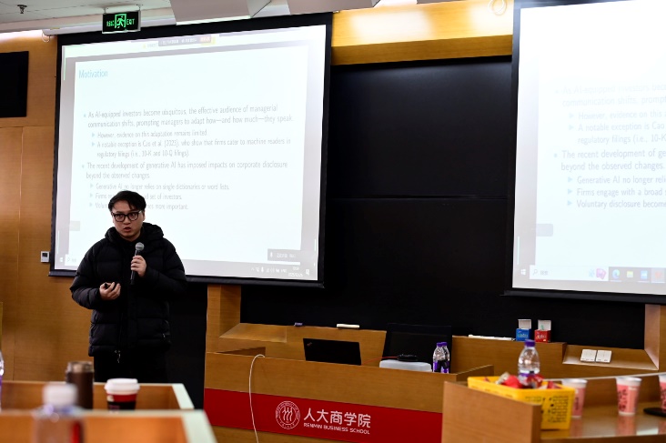 倪政辉作“Talk to AI-Equipped Investors: A Field Experiment”主题报告。文章研究了在线业绩说明会中提问者的人类或AI身份对上市公司管理者信息披露和市场反应的影响。研究发现管理者回答AI提问的概率降低且回应语气更中性,同时投资者在AI提问期间延迟交易。姜纬对文章研究问题和RCT方法的新颖性表示了认可,并对基于实验结果的研究结论提炼提出了建议。