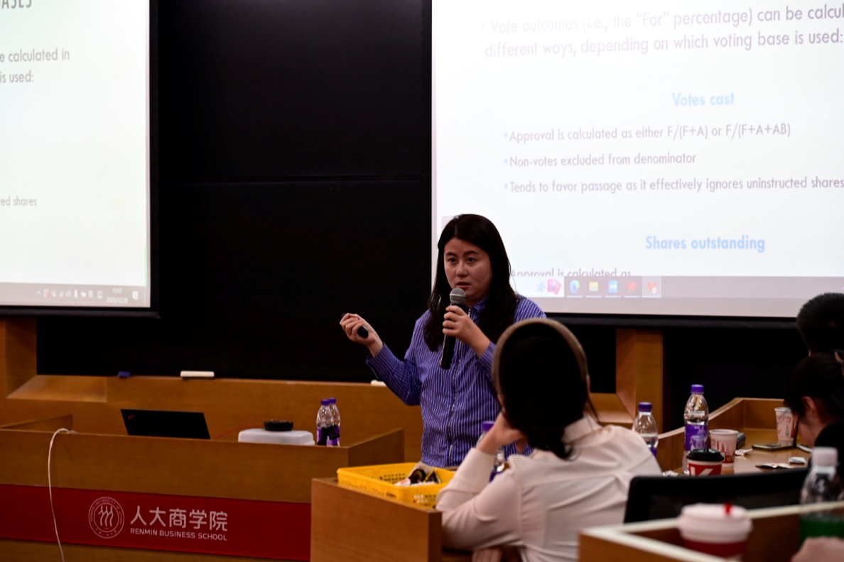 任泓霖作“De-Facto Voting Power and the Value of Voting Rights”主题报告。文章研究了股东投票率对公司投票权市场价值的影响,发现投票权价值随投票率下降而显著上升,且低投票率具有持续性并能预测未来公司治理冲突事件。姜纬对该文章对政策效果研究的边际贡献表示了认可,并对实证结果的解释与可能的内生性问题提出了建议。
