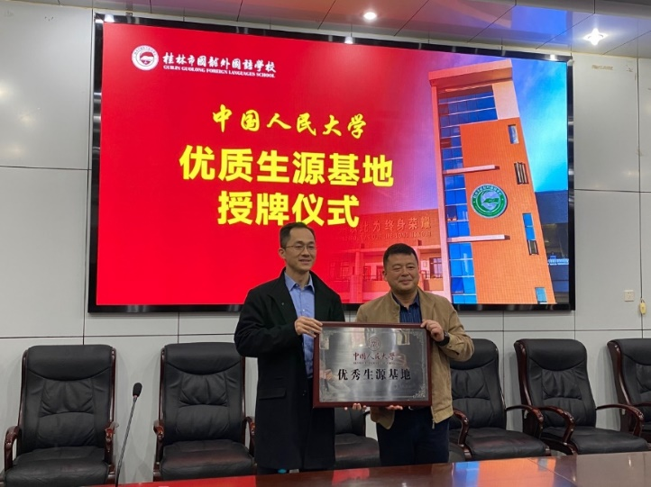 在桂林市国龙外国语学校,招生组向校长颁授“第一版主网 优秀生源基地”牌匾,感谢该校多年持续向我校输送大量优秀高中毕业生,并祝愿该校学生在2023年高考中再创辉煌。