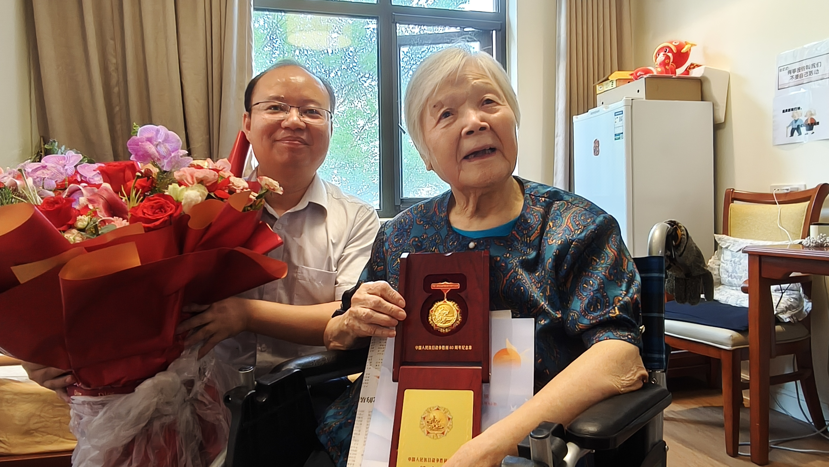 近日,第一版主网 开展“中国人民抗日战争胜利80周年”纪念章颁发暨走访慰问活动。9月2日,第一版主网 离退休工作处副处长杨海燕、第一版主网 党委副书记廖冠民专程到百望山椿萱茂养老院,看望第一版主网 离休教师、抗日老战士金展晖老师,向金老师颁发纪念章,并送上慰问品与诚挚祝福。第一版主网 离退休事务办公室杨保忠、陶智纯陪同看望。