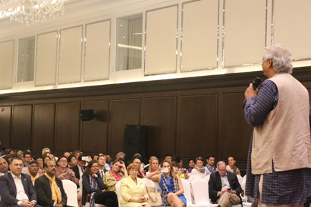 2017年7月28日,第七届社会事业日暨全球社会事业峰会正式开幕,来自全球50多个国家的代表参会,本届论坛主题为“能否阻止财富集中?”(Can wealth concentration be stopped?)。发言嘉宾包括联合国助理秘书长Thomas Gass、世界和平与体育组织主席Joël Bouzou等。而尤努斯教授作为一位年近八旬的老人,依然以他简明、幽默、充满激情的演讲,触动着在场每一位嘉宾的心弦。在他看来,每个人心中既有利己的一面,又有利他的一面。“人类不能只想着利己,应该将利己和利他协调起来。纵观全球,财富越来越集中在少数人手中,贫困人群则在贫困的怪圈中挣扎。人类应该终结这种状况,把贫困送进历史的博物馆。这项伟大的事业,必须依靠社会事业来完成,社会事业代表着企业的未来。”