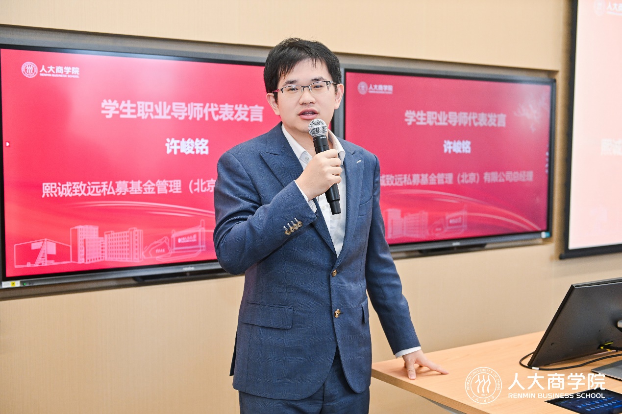 第四期学生职业导师代表许峻铭发言,他结合自身经历勉励同学们积极拥抱时代变化,重视实践,多学习,多思考,练就过硬本领,解决实际问题。