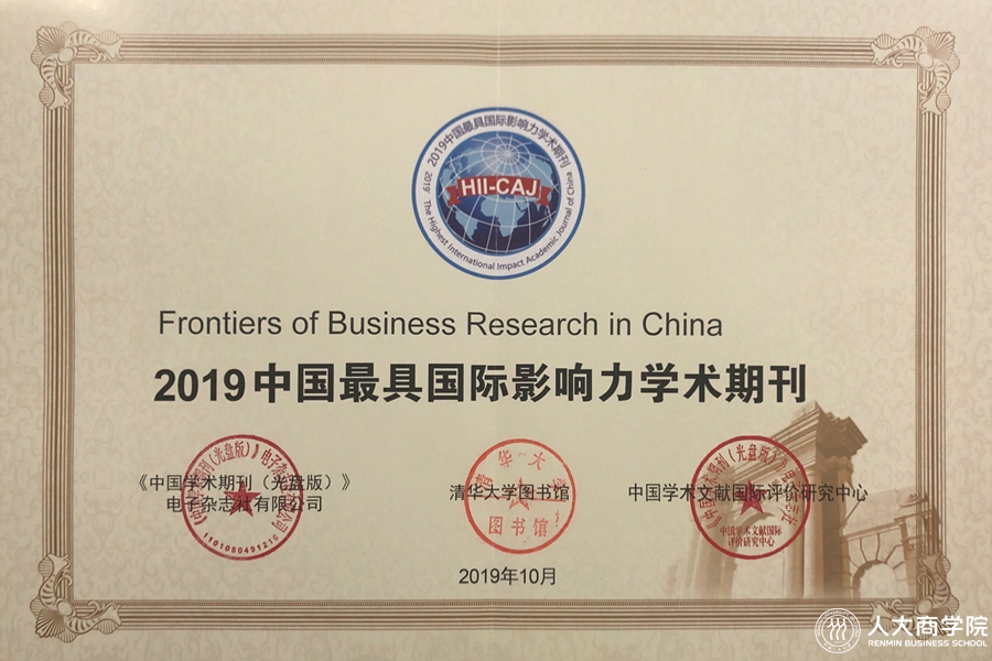 Frontiers of Business Research in China(FBR)获评“2019中国最具国际影响力学术期刊”
